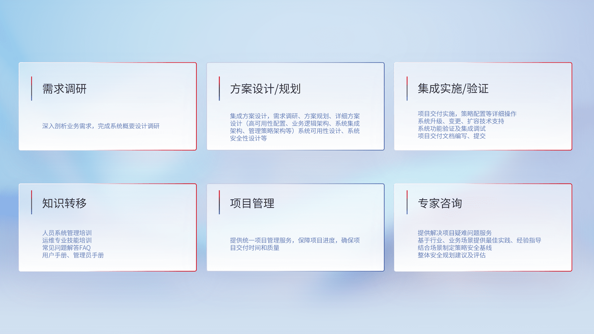 针对客户行业特性,,,将宏观的安全战略和需求,,,通过专业的交付服务,,实现项目落地,,,为客户提供标准规范的集成交付服务。。。。